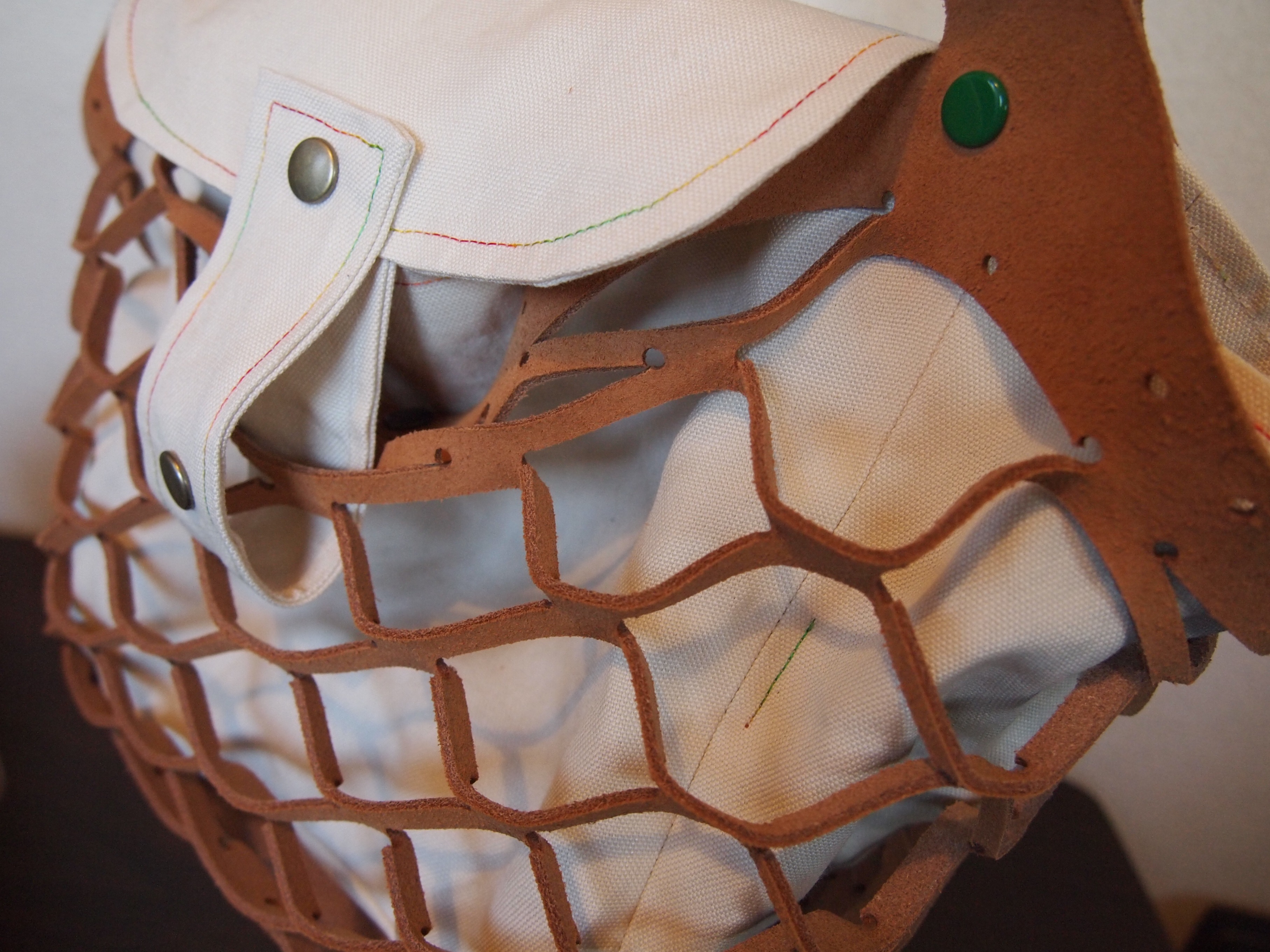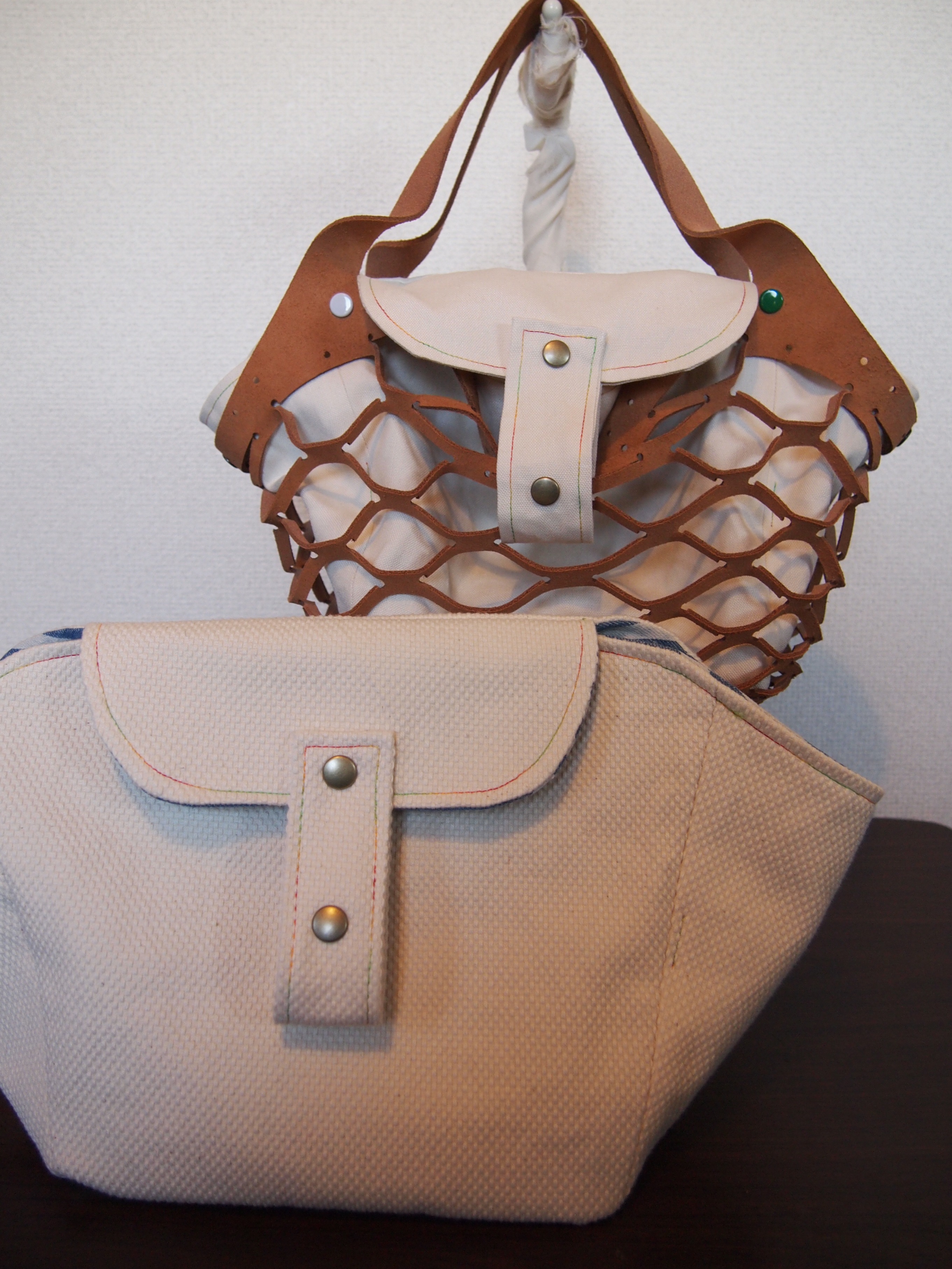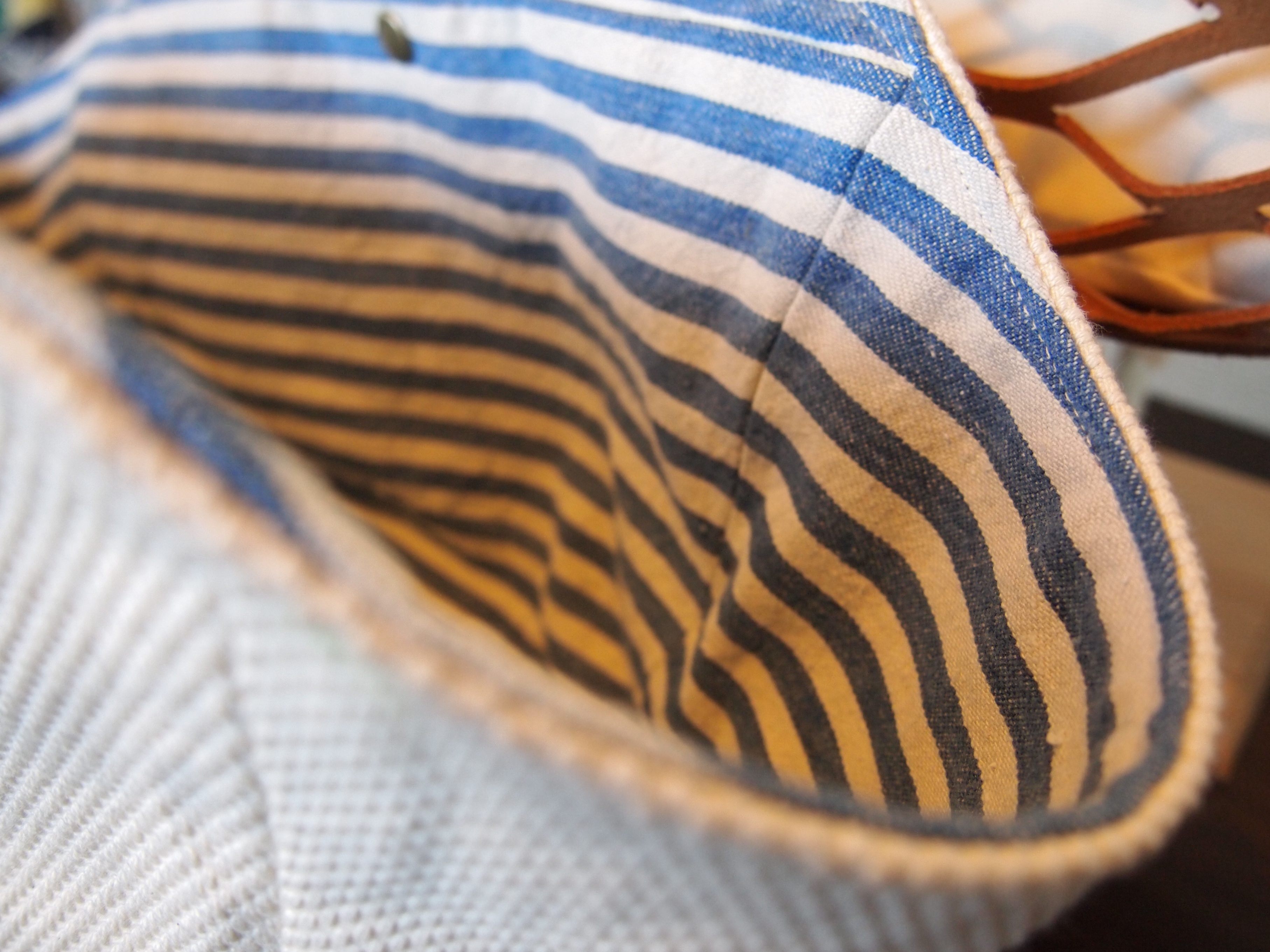 素材は刺し子の生地と麻帆布地で裏地はインディコ染めのボーダーになってます。
